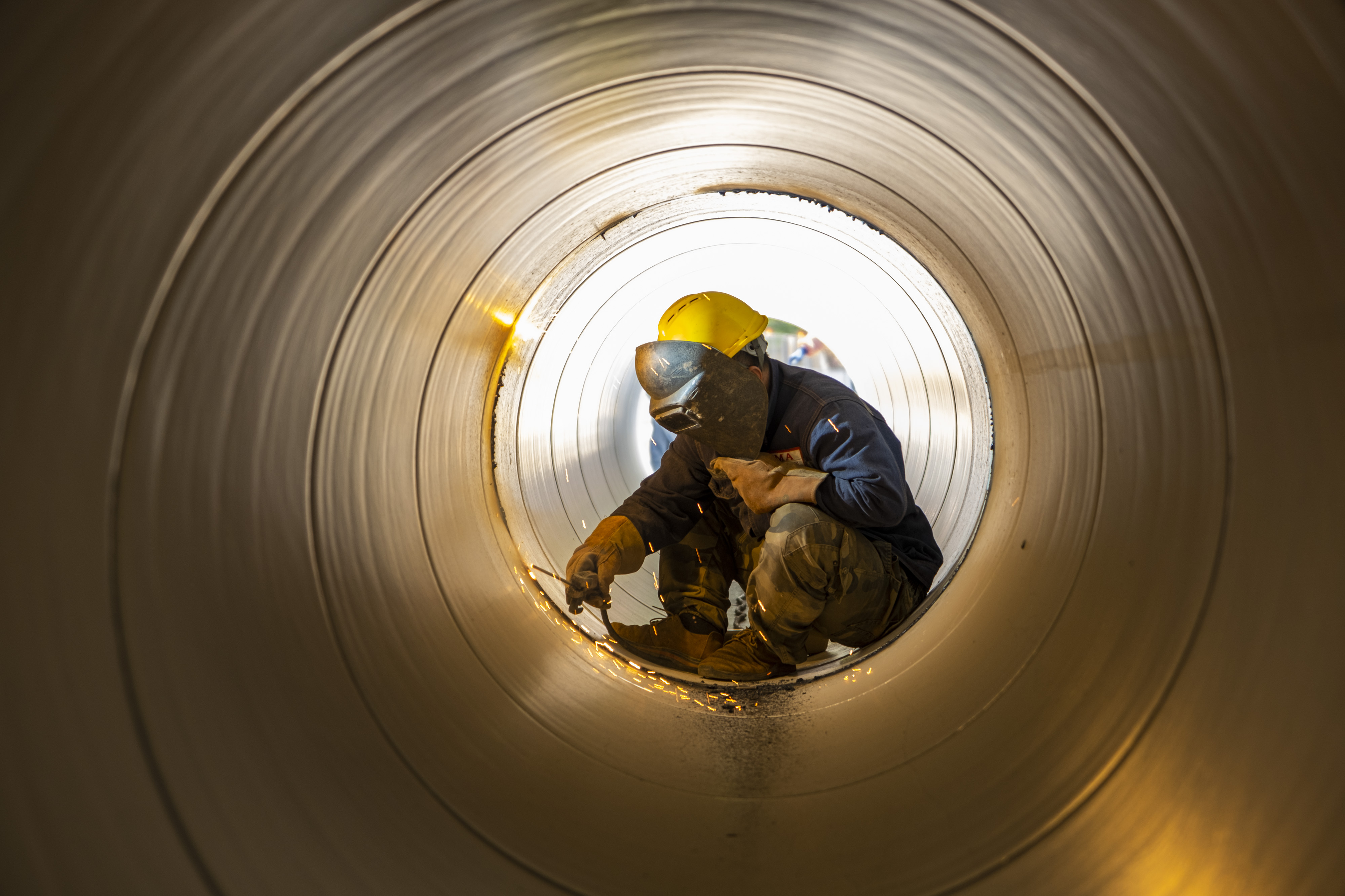 ▲綠城水務加快推進五象供水加壓站擴建DN1000出水管建設,圖為施工工人正在焊接管道(水建公司 金志華供圖)