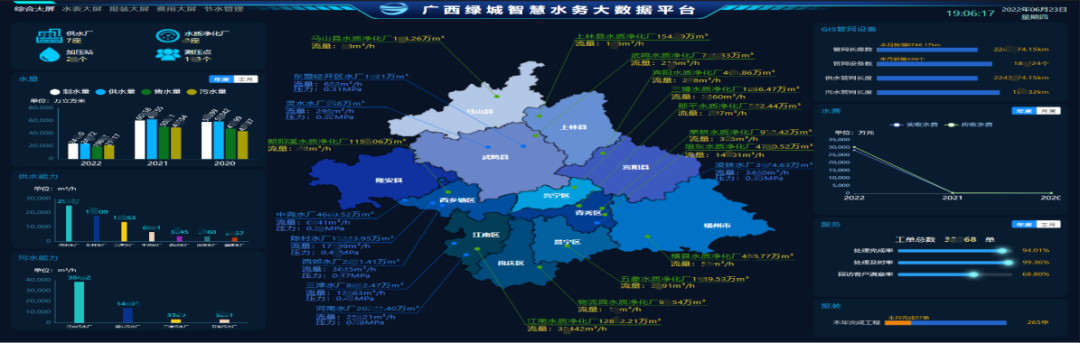 綠城水務(wù)大數(shù)據(jù)平臺于2019年9月啟動建設(shè),于2020年12月建成,主要包括數(shù)據(jù)機房和平臺軟件建設(shè),投資約1100萬元,該平臺于2021年6月取得了國家版權(quán)局頒發(fā)的計算機軟件著作權(quán)登記證書。綠城水務(wù)大數(shù)據(jù)平臺是綠城水務(wù)整個智慧水務(wù)項目的數(shù)據(jù)大腦,平臺按“一個中心、三大體系、五大板塊”的架構(gòu)設(shè)計,整合了營銷收費系統(tǒng)、報裝系統(tǒng)、生產(chǎn)調(diào)度系統(tǒng)、地理信息系統(tǒng)、供水服務(wù)熱線系統(tǒng)的運行數(shù)據(jù),通過可視化圖形直觀呈現(xiàn)平臺數(shù)據(jù),以更加“智慧”的方式輔助水務(wù)企業(yè)進行管理和運維,為業(yè)務(wù)開展及管理決策提供了精準(zhǔn)、及時、有效的數(shù)據(jù)支撐,保證可靠供水,降低產(chǎn)銷差,提升運營管控能力,以數(shù)字化轉(zhuǎn)型賦能企業(yè)高質(zhì)量發(fā)展。