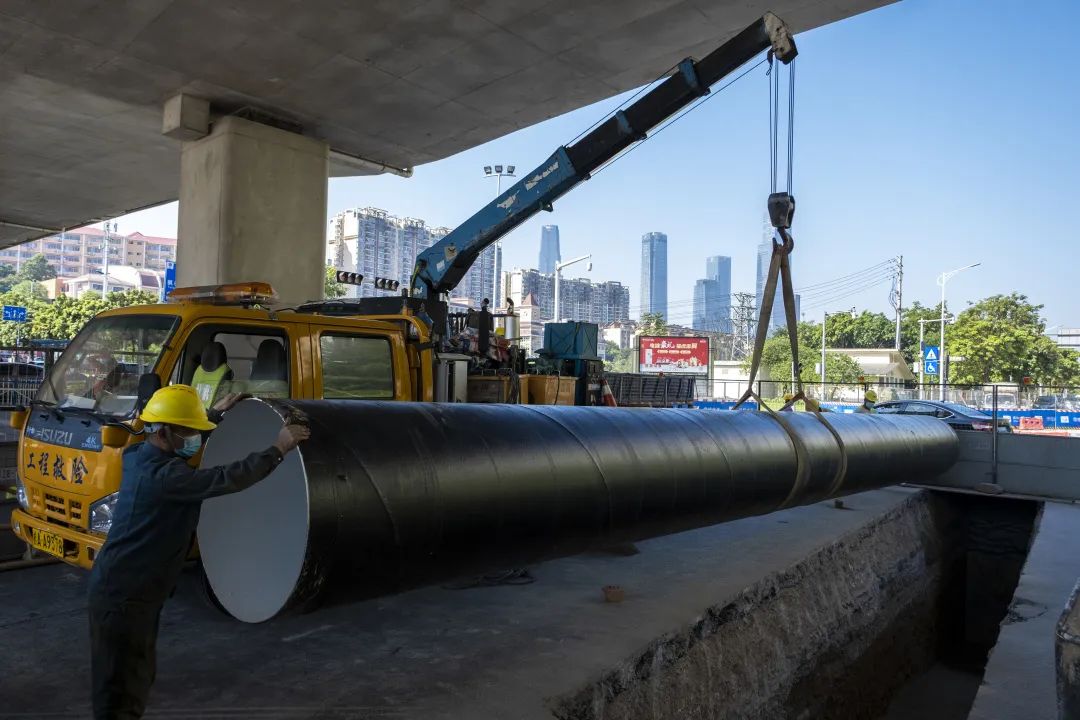 ▲綠城水務加快推進五象供水加壓站擴建DN1000出水管建設,圖為施工工人正在焊接管道。水建公司 金志華供圖